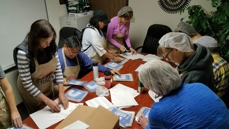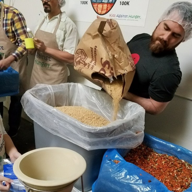 So, THIS is the fun part. This is going to take me a while to describe. I was a bagger, which meant I held open the bags for the ingredients to be dumped in. The bags were the ones that had already been labeled. The ingredients were: soy, veggies, vitamins, and rice. I’m saying this in the order of the chant we made up when we dumped the ingredients in. You have to remember who dumped it in before you. (photo cred: Dan)