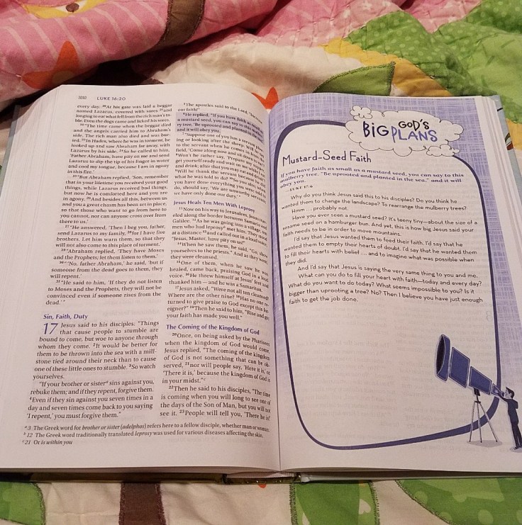 I knew the girls would like this one the most when I saw it. They love a good mystery book. The theme of the *NIV Investigator’s Holy Bible is that of detective and discovering something beyond the surface. Each book has different sections that help kiddos understand the story more: The Evidence, The Witnesses, Breakthrough!, The Scene, Check the Facts, and Case Closed!