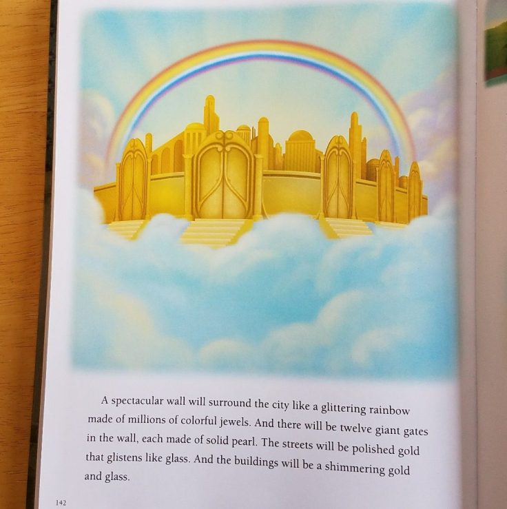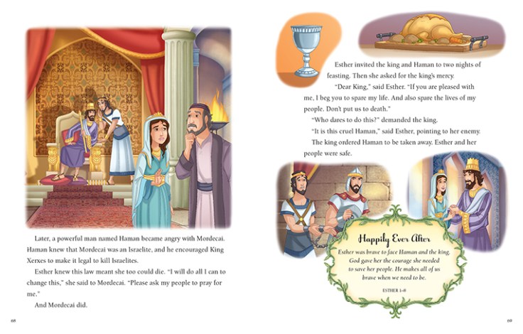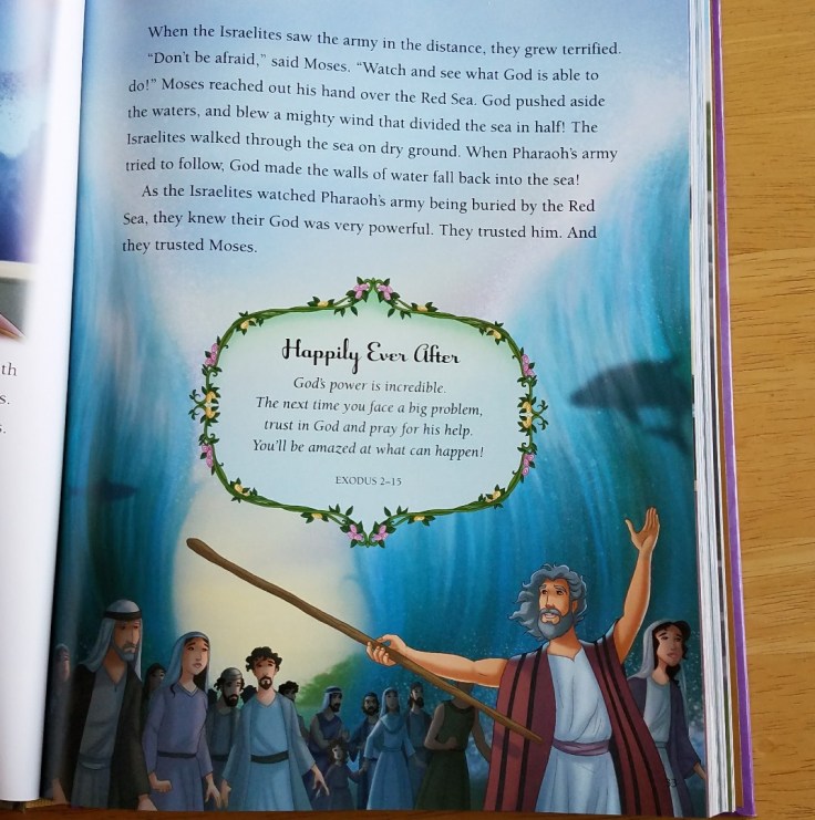 The Once Upon a Time Storybook Bible has beautiful illustrations. There are 18 Old Testament stories and 15 New Testament stories. Each story includes a Bible verse, “Once Upon a Time,” the story on 4 pages (1 page is usually a full-page illustration), and ends with a Happily Ever After Scripture reference.