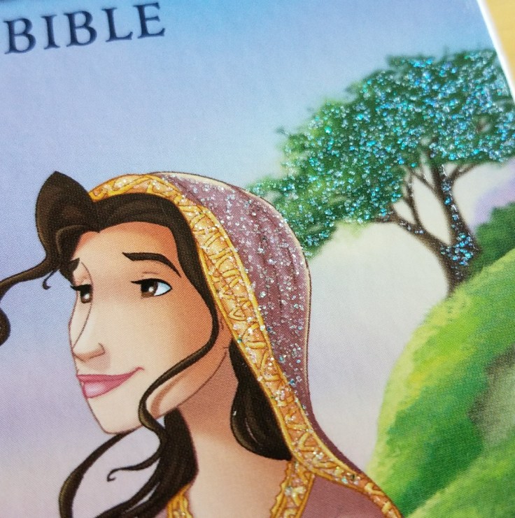 The Once Upon a Time Holy Bible is a full-text New International Reader’s Version (NIrV) translation. It features 6 Bible stories with 4 full-color illustrated pages for each story. In the third picture under Melody’s review, you can see that the cover is sparkly, which everyone knows would be Emily’s favorite thing about this Bible if she reviewed it. :p I would have liked to see a few more stories highlighted, but like Melody said, I do like that it is a full Bible that is lightweight. It makes for easy transport if you bring it to church or Bible study. The highlighted stories draw the readers into what other great stories may be in the Bible. (It also comes in a pink leathersoft edition.)