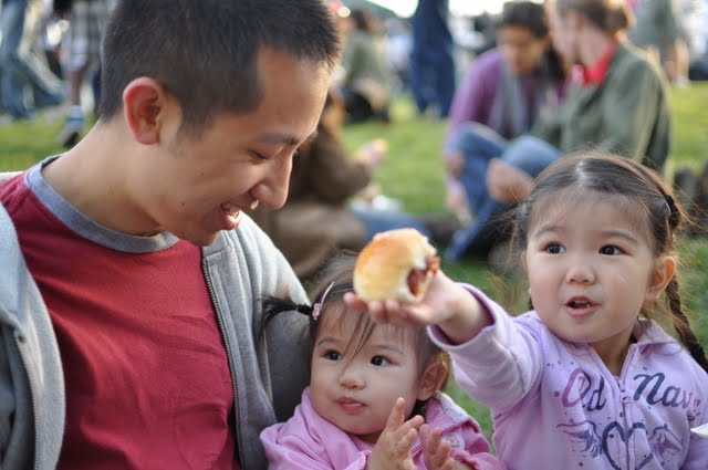 This is a sweet story of a girl and her dad. The daughter takes great care to prepare for a special time with her dad. While there aren’t many feather boas, sparkly dresses with ribbons, or paper crowns with jewels around here anymore, I love watching the girls’ relationship with their dad grow each and every day. There are lots more moments and memories than the ones I have posted, and I’m sure that more of them are food-related, but it seems the girls like to explore their world together with their dad – from San Francisco to Monterey, from Australia to the pumpkin patch, and beyond! The book gives a great reminder that sometimes we can enjoy those around us in the simple, everyday moments.