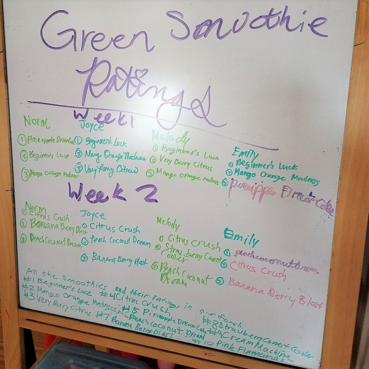 You can read more of our thoughts on each of the 10 smoothies on these posts: Update #1 and Update #2, but here’s the rating board Melody made for us to track which ones we liked best.