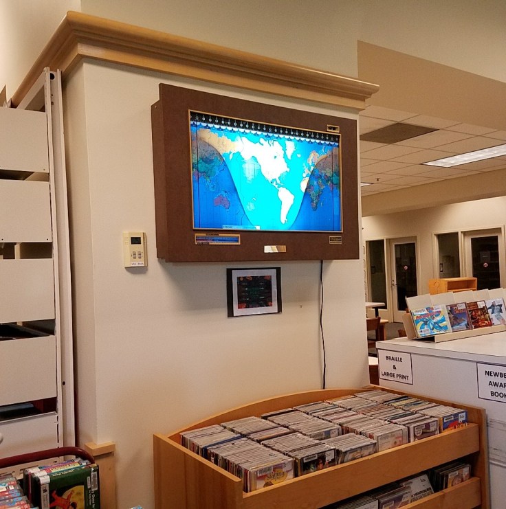 We spotted this and thought it was cool. The bright part is where it’s daytime. The dark part is where it’s night.
