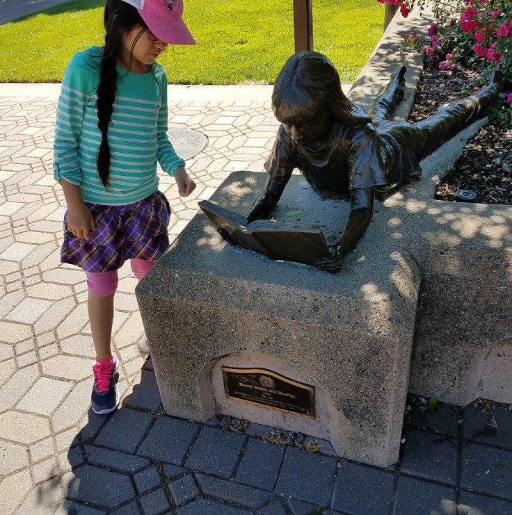 The front of the library had statues. The first one we thought was cool – a girl reading.