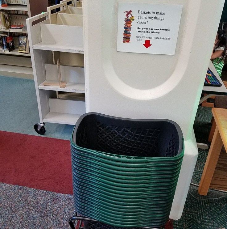 There are baskets if you don’t have a library bag or forgot to bring yours!