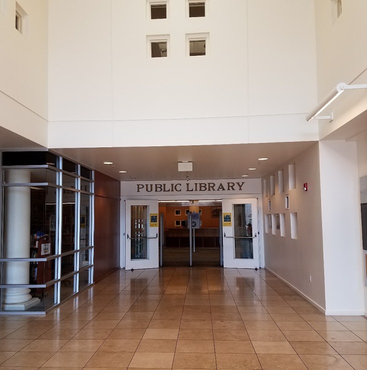 When you enter the library, there’s a sign that says, “Public Library” and a gift shop/cafe (aka Bookmark Cafe) on the right side. (Shown above. It’s the little area sticking out behind the bike racks.) On the left corner, there is a Friends of the Library bookstore. On the left side, there is a hallway that leads to a theater and some meeting rooms(?). On the left near the entrance, there is a police department office.