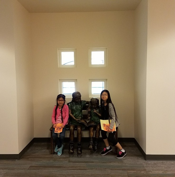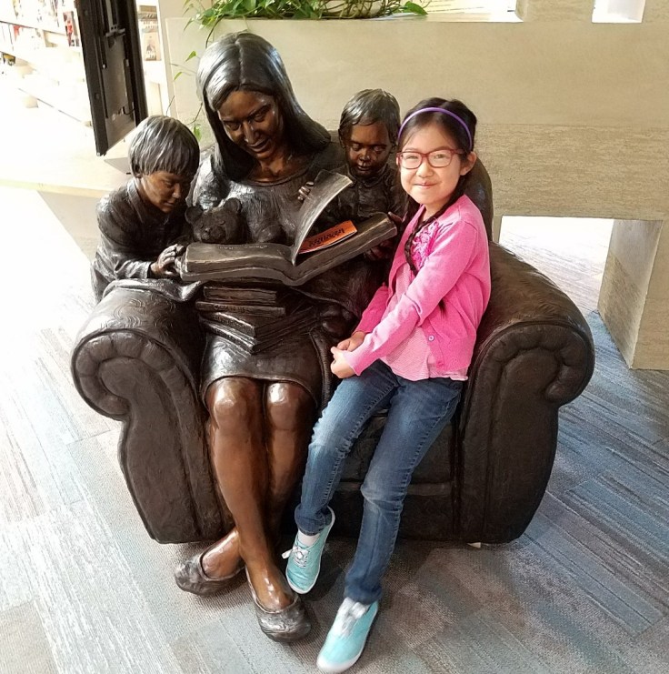 One of our favorite things at this library is the chair with the mom and her two kids. The mom is reading a book. I wonder what book it is? (I’m not sure the stories behind these statues, but we see them at all the libraries, and hopefully, I can do some “then and now” photos of the girls with them through the years.)
