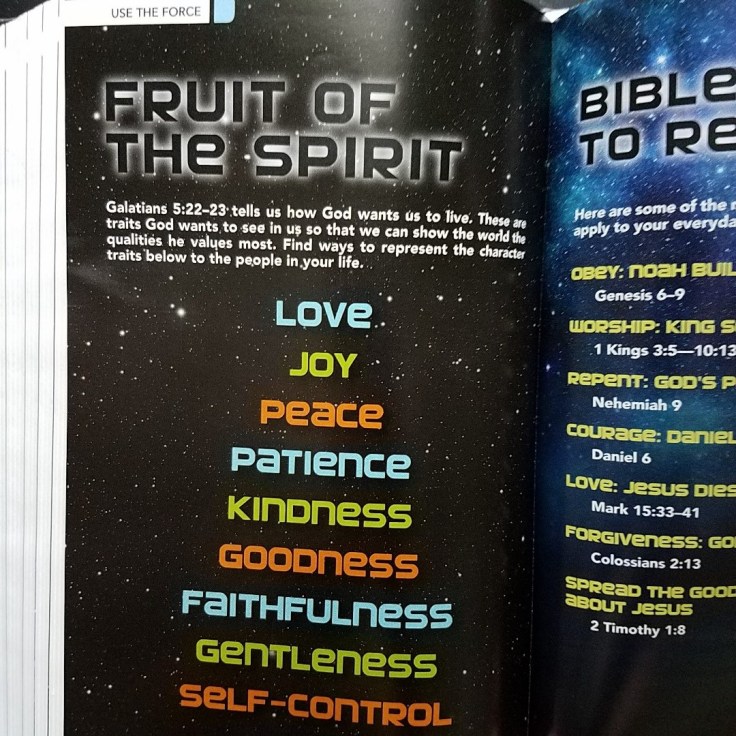 The May the Faith Be With You Holy Bible is perfect for kiddos ages 6-10 who love outer space, intergalactic themes, Star Wars, or just reading the Bible. There are a few spreads that point to answers to questions or topics to discuss, like the Fruit of the Spirit page below.