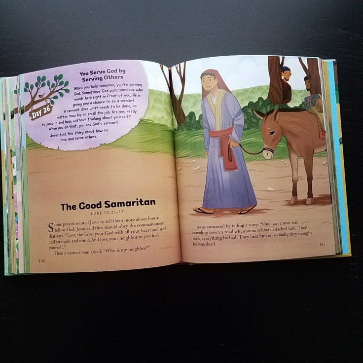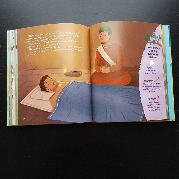 Rick Warren takes 40 stories from the Bible and weaves in details of how God was able to help each of the people in the Bible find out what they were meant to do with their lives. We aren’t always able to see what purpose we have in the little everyday moments but it was the same for many of the people in Bible times. They were usually ordinary people doing ordinary things that God made extraordinary when they lived out their purpose. The themes from each day’s story is relatable to young children and the “Think, Remember, Question” section at the end of each story’s 6-page spread wraps up the reflection time well.