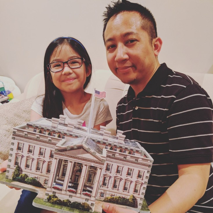 Last year we flew across the country and visited Washington DC. We walked and walked and walked in the 90-degree heat at the National Mall and toured the Library of Congress and whispered in the Supreme Court and more, but there was one building we didn’t quite get near…lots of security and something about an Easter Egg Roll. 😛 Over the winter break, Norm and Emily worked together on this 3D puzzle. It was our first 3D puzzle…well, theirs…it was slightly overwhelming to this HSP. Good teamwork, team!!