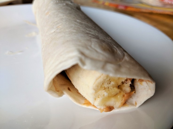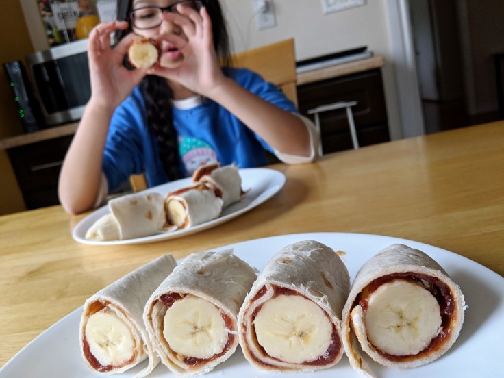 - Place banana near the edge of tortilla and roll up toward the other end of the tortilla.