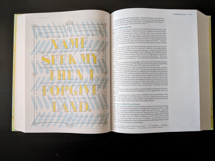 This Bible has lovely verses printed on the side of some pages or on the whole page. They are colorful and add to the message of the Bible. There is also space for you to journal which is perfect for someone who loves to take notes.