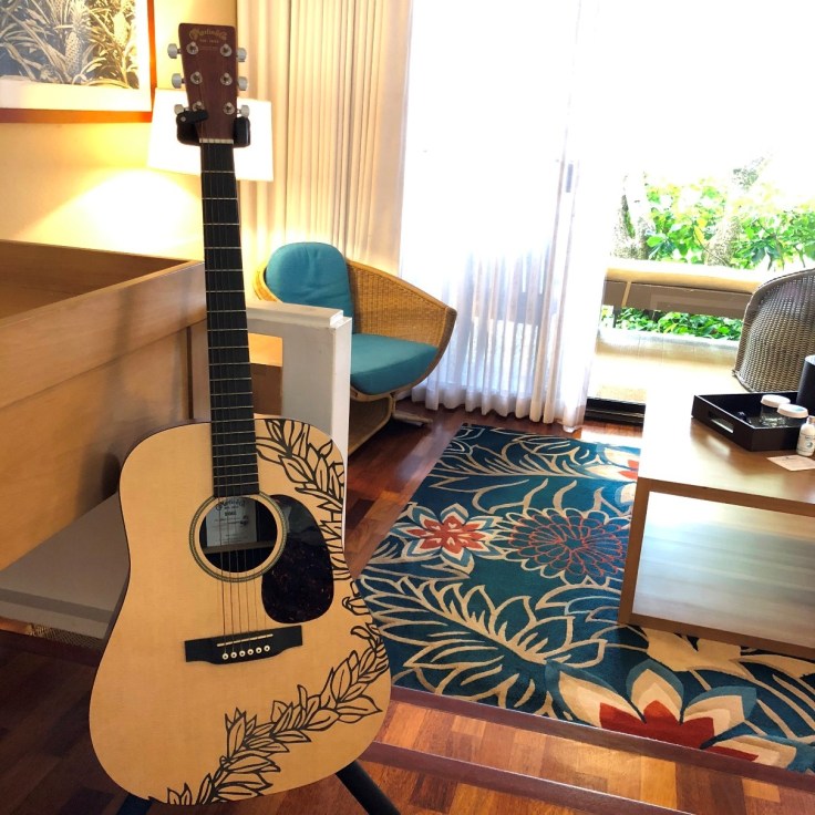 There was a guitar with designs on it. Also, it said Turtle Bay on it.