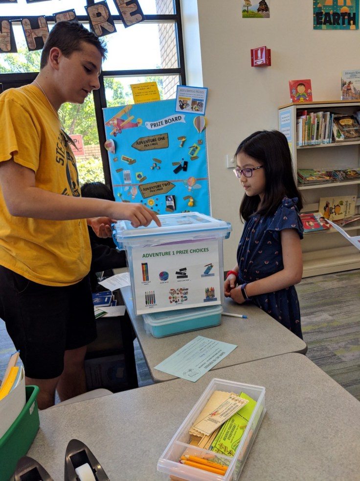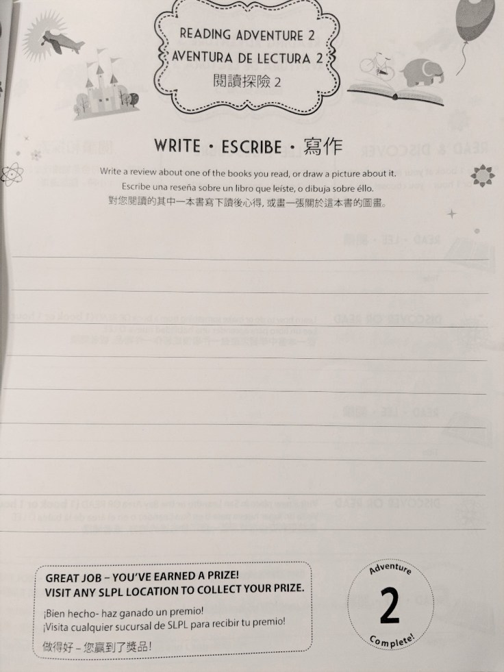 We’re working on it! For each Adventure (there are 3 opportunities to earn a prize from the prize board), you can read 5 books, read for 15 minutes 5 times, or read and choose a discover activity which can be participating in a program at the library or learning new facts. Then you choose one thing to write about or draw a picture of. There are lots of fun movies, shows, and storytimes to attend every week!