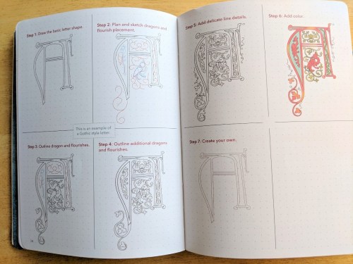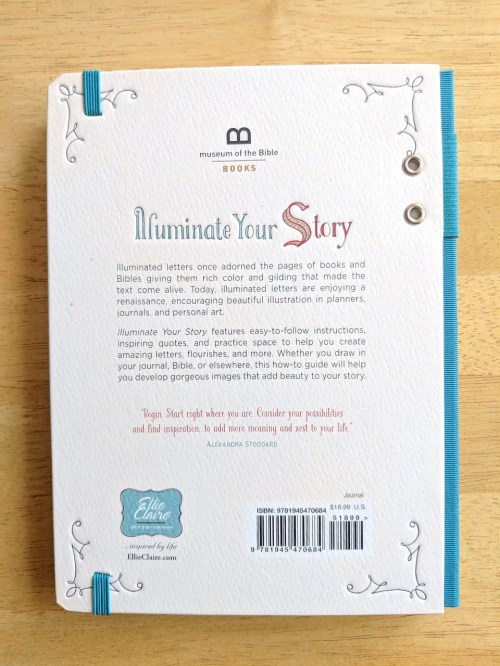 The Illuminate Your Story Journal starts with an introduction on how artists used to create the “illuminated manuscript” as an “overflow of his heart and a spiritual act of worship. The “illuminated” beauty of the gold or silver leaf decoration within texts captured the attention of its audience. Through the pages of this journal, there are spaces with step-by-step instructions on how to draw the letters of the alphabet with details, as well as other drawings, and there are lined pages with quotes and Scripture. There is a pen loop on the spine of the journal to hold your favorite pens to create wherever you bring your journal. In the back, there is a “pocket” on the cover to hold keepsakes, and there is a band to hold the journal closed.