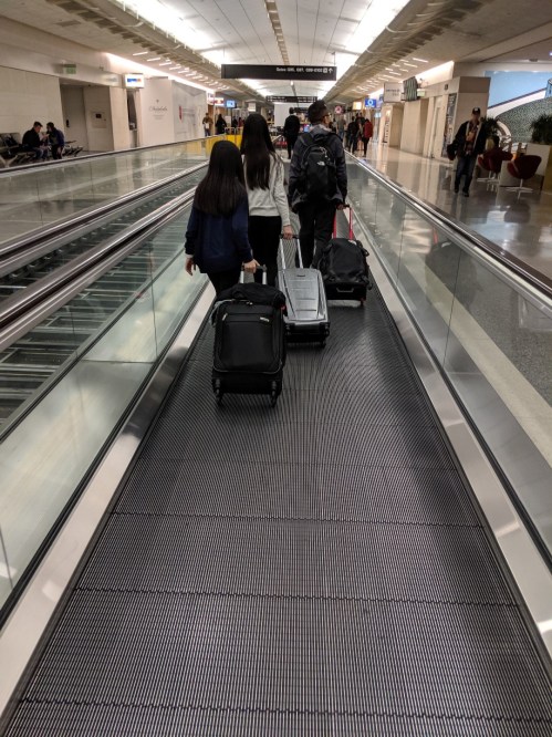 On our way to the gate using the moving walkway aka travolator aka moving pavement aka travelator aka people mover.