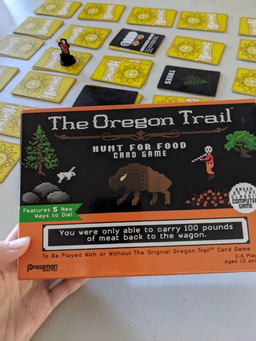 This game brings back so many memories of the old Oregon Trail game on the Apple IIe computers in elementary school in the 1980s. There are many different versions of the card game but *The Oregon Trail: Hunt for Food Card Game – Based On The Classic Computer Game by Pressman is the one we own. It’s more or less a collaboration game. While you work together, players can lose if they end up with an illness/drowning/lost card.