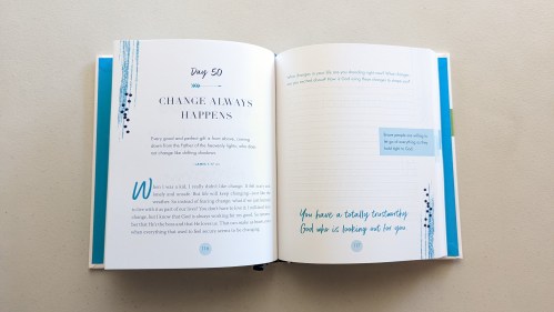 Each day’s devotion has a verse, a short devotional thought, thought-provoking questions, and a space to journal. I love that each short devotion addresses important things that may come up for kids but aren’t necessarily discussed.