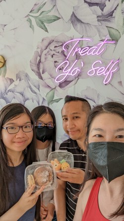 Our last stop was at this cute new-ish bakery cafe. We each picked out a treat – tiger sugar macaron for me, corgi passionfruit macaron for Emily, a strawberry cream puff for Melody, and pineapple macaron for Norm. It’s a really cute shop and there is outdoor seating. You can also order drinks, other desserts, cakes, and cute merch. It looks like they were doing a shoot for something new that’s coming, or maybe just for the socials. If it’s something new, you heard it here first. Tip for Always Yours: If you really want to get a certain treat, go early in the day. Most of the macarons were cleared out by the time we got there. It was an hour to closing time.