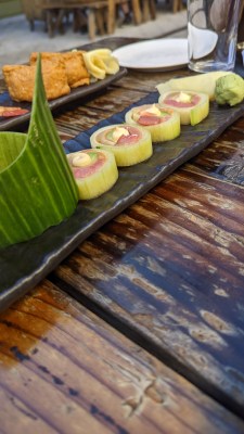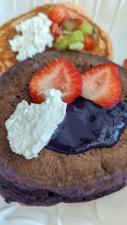 We got a later start than we had planned and most of the tables were taken by the time we got there so we opted to take it back home (aka our pretend Airbnb 😛) to eat. Lots of tables freed up after we had already ordered. If we were on vacation, there are lots of breakfasts we like to eat in our hotel room so we can multi-task getting ready to be out all day. We wanted to keep it light since we are wannabe foodies since we’d be eating most of the day. Trying new foods or foods from different places is something we do on our trips. We have been to Denica’s before but we have never had their ube pancakes and guava pancakes. The Ube Pancakes were purple yam pancakes with ube coconut sauce, Denica’s whipped cream, banana, and mixed berries. The Pink Guava Pancakes were guava chiffon pancakes, with tropical pink guava sauce, Denica’s whipped cream, and fresh strawberries and kiwi. We also ordered Ube-Bae cookies, a Mango malasada, and a Pineapple Jam malasada. (I think the malasadas are from Bay House Cakery.) Tip for Denica’s: It’s not too bad, but go earlier than later. The parking lot fills up quickly.