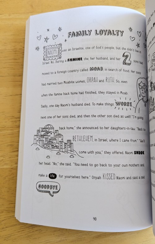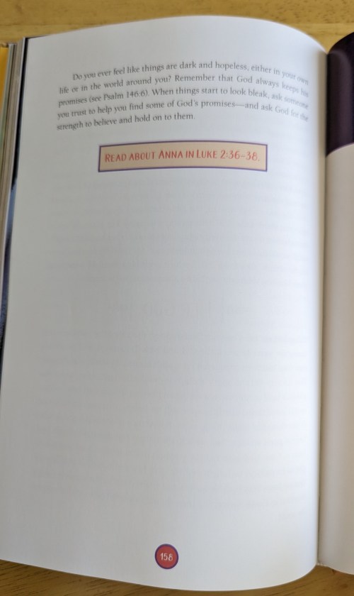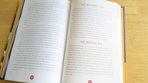 This was a really artsy book with big letters, (uncolored on arrival) but I managed to read through most of it! It included a lot of Bible stories and people in the Bible. How it was told in third person and had the setting and characters in it was important to me when reading it and gave life lessons and stories in general. – Melody, age 16