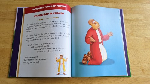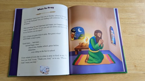 This book is divided up into three parts. There is an introduction to prayer; where, when, and how to pray, and the different types of prayer. In the part with the different types of prayers, it sometimes gives examples of how people in the Bible prayed. There is also a “Prayer Time” which asks questions of times you have prayed certain prayers and another little section at the end that has a prayer you can pray. The pictures in the book are vibrant. It is written in a very kid-friendly way to easy-to-understand words but also makes it clear what prayer is. – Joyce, mom