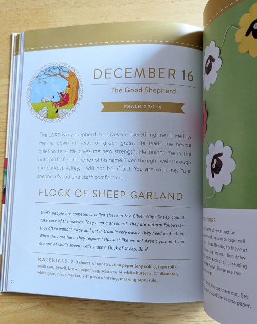 If you and your kids are crafty, this is a great Advent book for your family. Each day has a short reference to a verse or two for the Advent season and then there is a short reading that goes along with the verse and leading up to the craft that is related to the topic of the day. Many of the materials for the crafts are items you may be able to find around the house, which makes is a lot easier to do during this busy season. In the middle of the book, there are punch-out ornaments for each day of Advent that you can hang up as a reminder of the God’s love.