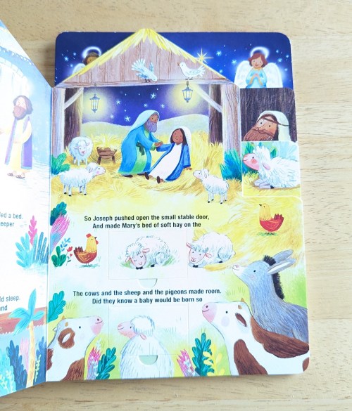This board book is a combination of rhymes and lift-the-flap fun. It may be a bit challenging for younger ones to come up with the rhyming words, but the illustrations will draw them in to learn about the first Christmas when baby Jesus was born. It’s not the complete story but gives a great overview that young children will enjoy.