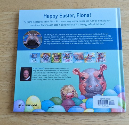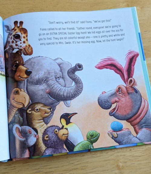 My nephews always enjoy these Fiona books and this one didn’t disappoint. They plan to go to the zoo next week so it was fun to see all the illustrations of the baby answers in the book. They missed going to an Easter egg hunt this year so they liked reading about Fiona and Rico hiding the Easter eggs, and then finding them along with the special egg!